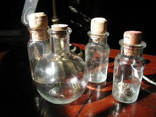 My four year-old nephew was eager to show me his bug collection. My sister has been collecting small glass bottles with large necks for him to put his bugs in versus a traditional glass case. They make for an interesting display on his bedroom dresser -